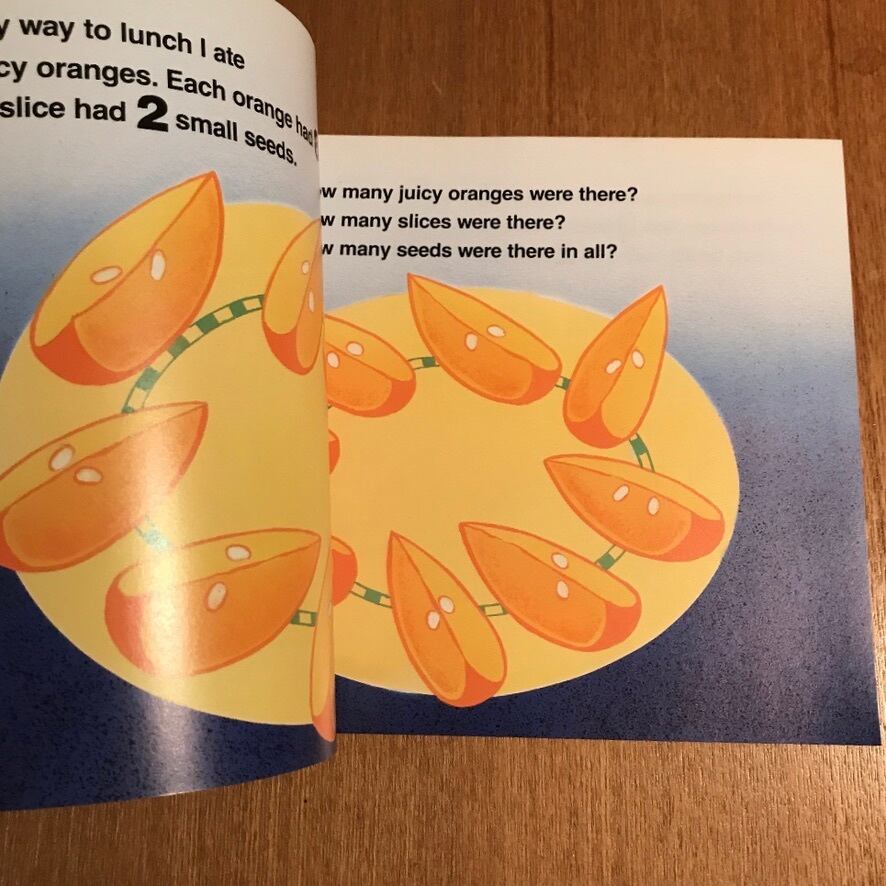各オレンジに8つのスライスがあり、各スライスに2つのシードがある場合、合計でいくつのシードがありますか?あなたはあなたの周りの世界に隠れている数学パズルを通してあなたの方法を掛け算、足し算、そして数えることを楽しむでしょう。
