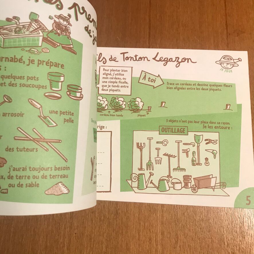 子供たちに庭仕事を教えるためのワークブックで、可愛らしいイラストで描かれています。